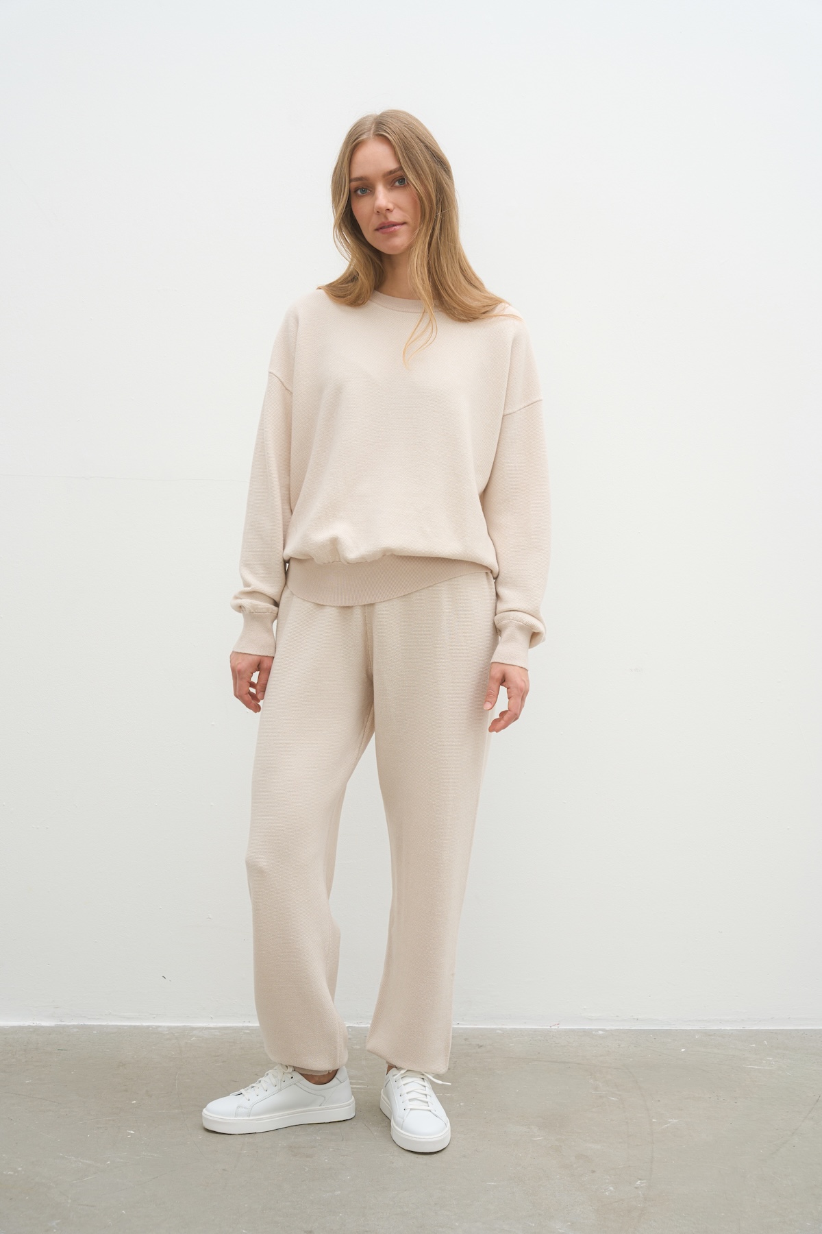 Patogios, aukštos kokybės kelnės iš 100 % Merino vilnos, megztos dvigubu, dviejų spalvų siūlu. Toks mezgimas suteikia gaminiui išskirtinį tvirtumą, vizualinį gylį ir švelnų, subtiliai melanžuotą paviršių.